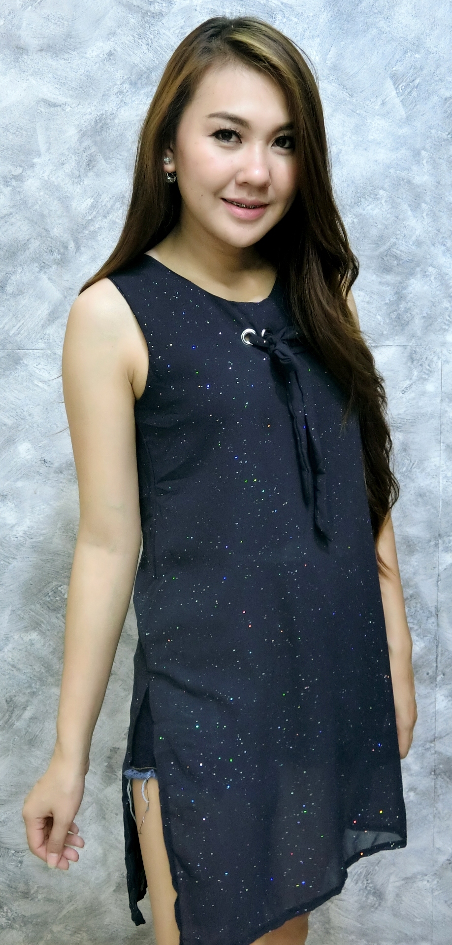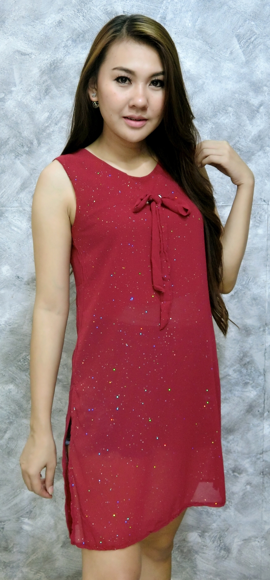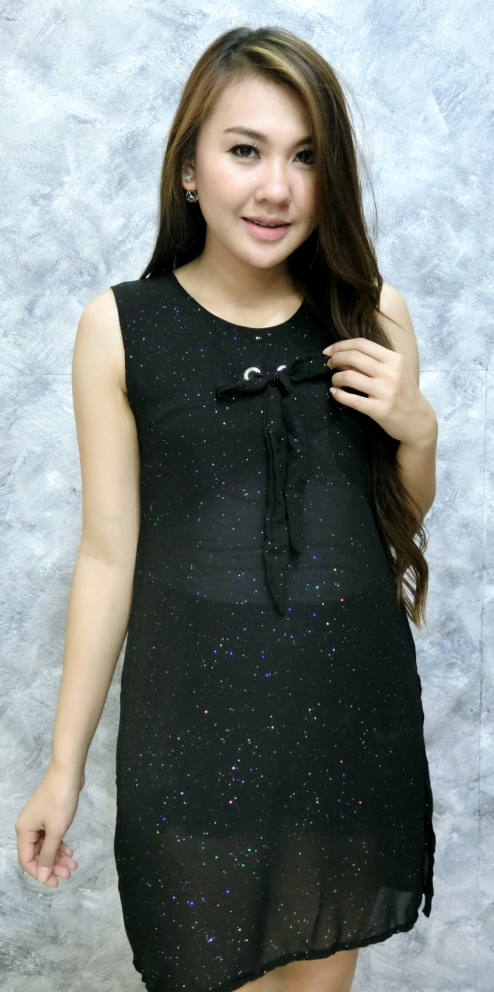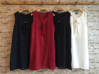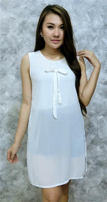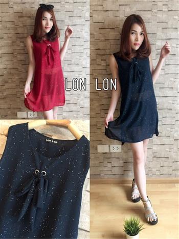 เสื้อแขนกุดชีฟองตัวยาว ผ้ากรีทเตอร์ เจาะตาไก่ผูกโบวหน้า ใส่สวยดีเทลเก๋